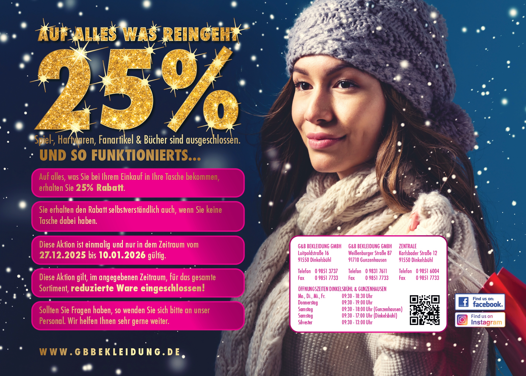 Auch nach Weihnachten sind bei uns viele, tolle Schnäppchen zu holen! Du erhältst auf das gesamte Sortiment 25% Rabatt – auch auf bereits reduzierte Ware!
